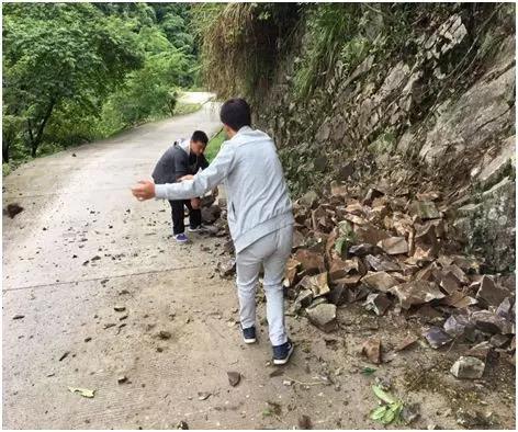 在進行測區控制控制點采集的路途中,由于近期陰雨連綿,導致前方山體滑坡,落石擋住了前行的道路,由于沒有工具,只能下車徒手對路面的滑坡堆積物和垮塌的碎石進行清理。經過一個多小時的奮戰,道路才恢復暢通。