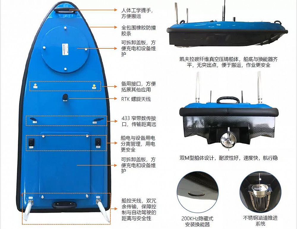 8、測深:內置200khz單頻測深儀,量程0.5m-200m,精度0.01H(水深),分辨率0.01m,模擬數據自存儲,數字數據實時串口輸出
